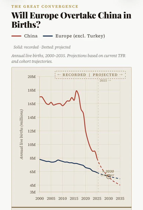Social media discussions and demographic analyses have highlighted this trend, with projections suggesting Europe could surpass China as early as the late 2020s if current trajectories hold. China’s births have already fallen sharply to around 7.92 million in 2025, while broader European figures (including non-EU countries) hover near or above that level in some estimates.