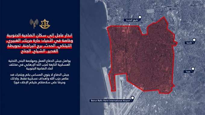 JUST IN: IDF Issues Urgent Evacuation for Southern Beirut Suburbs Near Rafic Hariri International Airport
