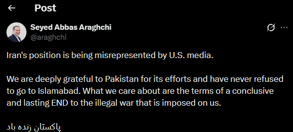 “Iran’s position is being misrepresented by U.S. media. We are deeply grateful to Pakistan for its efforts and have never refused to go to Islamabad. What we care about are the terms of a conclusive and lasting END to the illegal war that is imposed on us.”