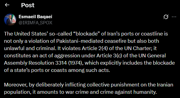 JUST IN: Iran’s Foreign Ministry Spokesman Esmail Baghaei Condemns U.S. “Blockade” as “War Crime and Crime Against Humanity” – Accuses Washington of Violating Pakistan-Mediated Ceasefire
