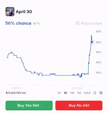 - Odds for Trump announcing the end of military operations by April 30 stand near 54%, reflecting a surge from lower probabilities earlier in the week.