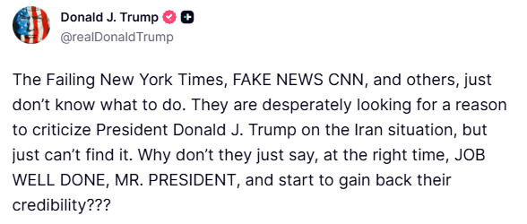 Trump claimed outlets like The New York Times and CNN are “desperately looking for a reason to criticize” his handling of the Iran situation but cannot find one, and suggested they should instead say “JOB WELL DONE, MR. PRESIDENT.”