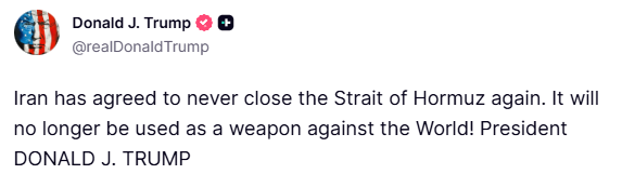 “Iran has agreed to never close the Strait of Hormuz again. It will no longer be used as a weapon against the World!”