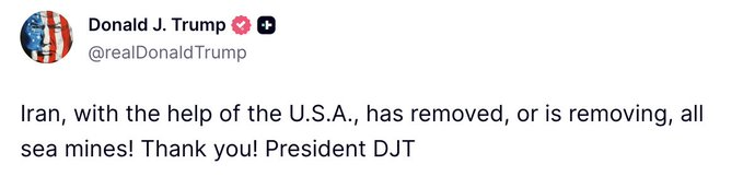 JUST IN: President Trump Claims Iran, With U.S. Help, Has Removed or Is Removing All Sea Mines from the Strait of Hormuz