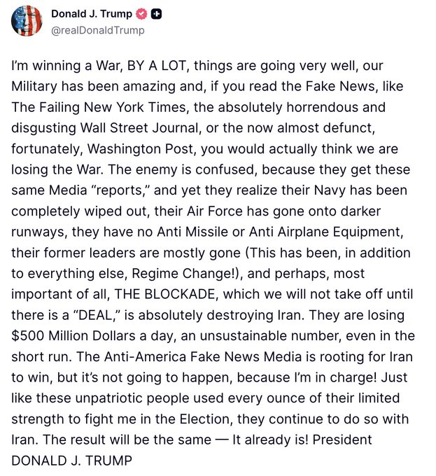 “I’m winning a War, BY A LOT, things are going very well, our Military has been amazing… The enemy is confused, because they get these same Media ‘reports,’ and yet they realize their Navy has been completely wiped out… perhaps, most important of all, THE BLOCKADE, which we will not take off until there is a ‘DEAL,’ is absolutely destroying Iran. They are losing $500 Million Dollars a day… The Anti-America Fake News Media is rooting for Iran to win, but it’s not going to happen, because I’m in charge!”