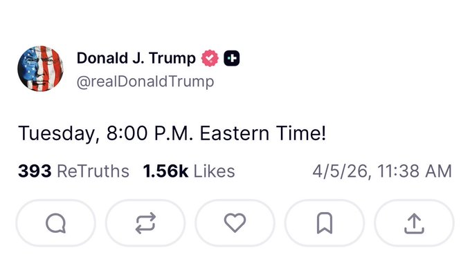 He later clarified the timeline with a follow-up post: “Tuesday, 8:00 P.M. Eastern Time!”