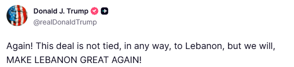 “Again! This deal is not tied, in any way, to Lebanon, but we will, MAKE LEBANON GREAT AGAIN!”