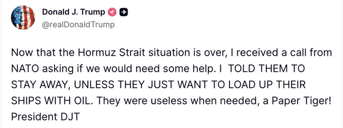 “Now that the Hormuz Strait situation is over, I received a call from NATO asking if we would need some help. I TOLD THEM TO STAY AWAY, UNLESS THEY JUST WANT TO LOAD UP THEIR SHIPS WITH OIL. They were useless when needed, a Paper Tiger!”