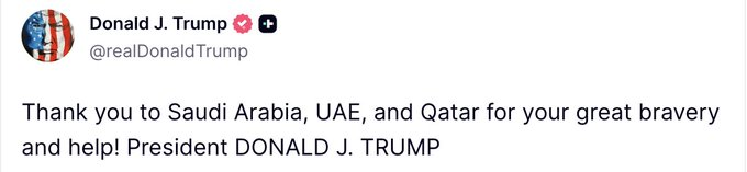 JUST IN: President Trump Thanks Saudi Arabia, UAE, and Qatar for “Great Bravery and Help” in Strait of Hormuz Situation