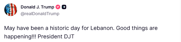 U.S. President Donald Trump has enthusiastically described the start of a 10-day ceasefire between Israel and Lebanon as a potential “historic day” for the country, posting on Truth Social: “May have been a historic day for Lebanon. Good things are happening!!!”