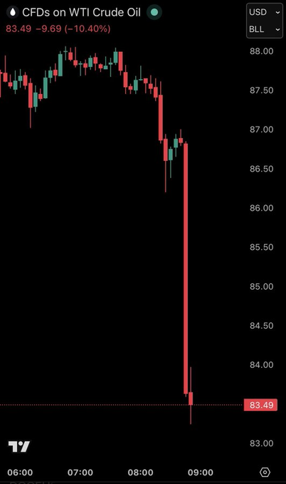 Brent and WTI crude saw sharp declines of up to 8–10% in early trading, with Brent briefly moving below $100 per barrel.