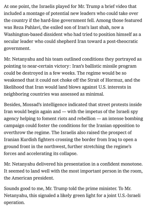 New York Times reporting details February Situation Room briefing where Israeli PM presented “near-certain victory” plan featuring a video of potential regime replacements, promises of quick missile destruction, minimal retaliation, and regime collapse — Trump reportedly replied “Sounds good to me”