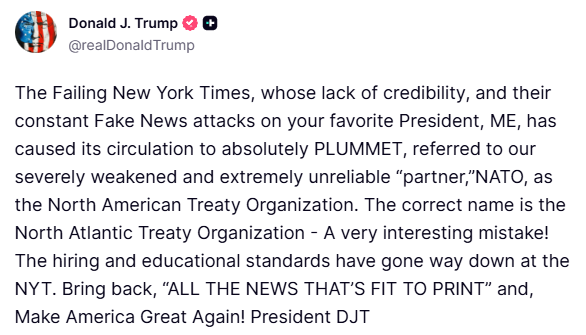 “The Failing New York Times… referred to our severely weakened and extremely unreliable ‘partner,’ NATO, as the North American Treaty Organization. The correct name is the North Atlantic Treaty Organization – A very interesting mistake!”