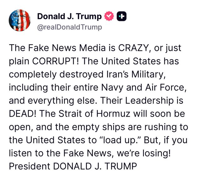 “The Fake News Media is CRAZY, or just plain CORRUPT! The United States has completely destroyed Iran’s Military, including their entire Navy and Air Force, and everything else. Their Leadership is DEAD! The Strait of Hormuz will soon be open, and the empty ships are rushing to the United States to ‘load up.’ But, if you listen to the Fake News, we’re losing!” — President Donald Trump
