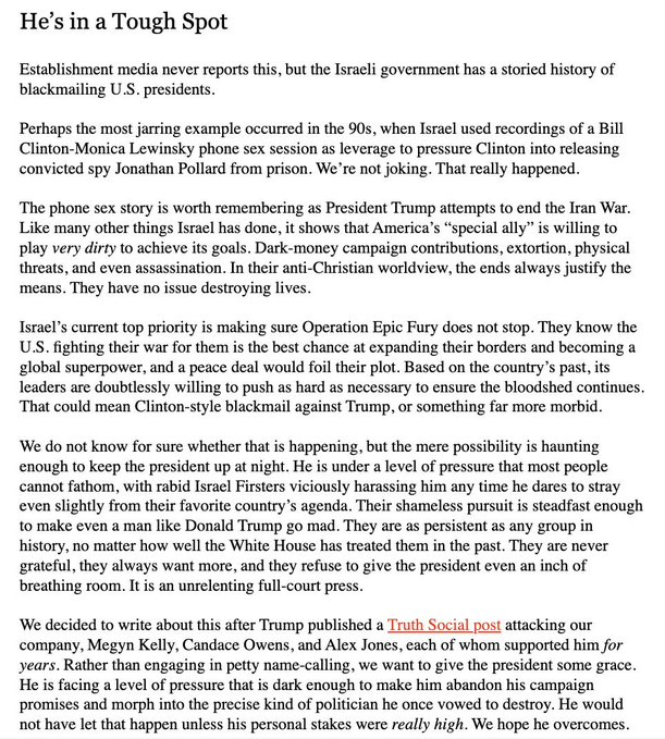 “Trump is under a level of pressure that most people cannot fathom, with rabid Israel Firsters viciously harassing him any time he dares to stray even slightly from their favorite country’s agenda.” — Tucker Carlson Network